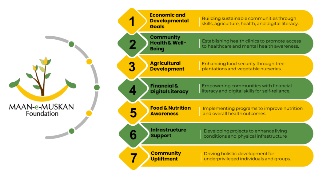 At Maan-e-Muskan, our objectives are rooted in fostering sustainable development and empowering communities across Pakistan. By addressing critical challenges in health, education, economic growth, and gender equality, we aim to create inclusive opportunities that inspire resilience and long-term progress.